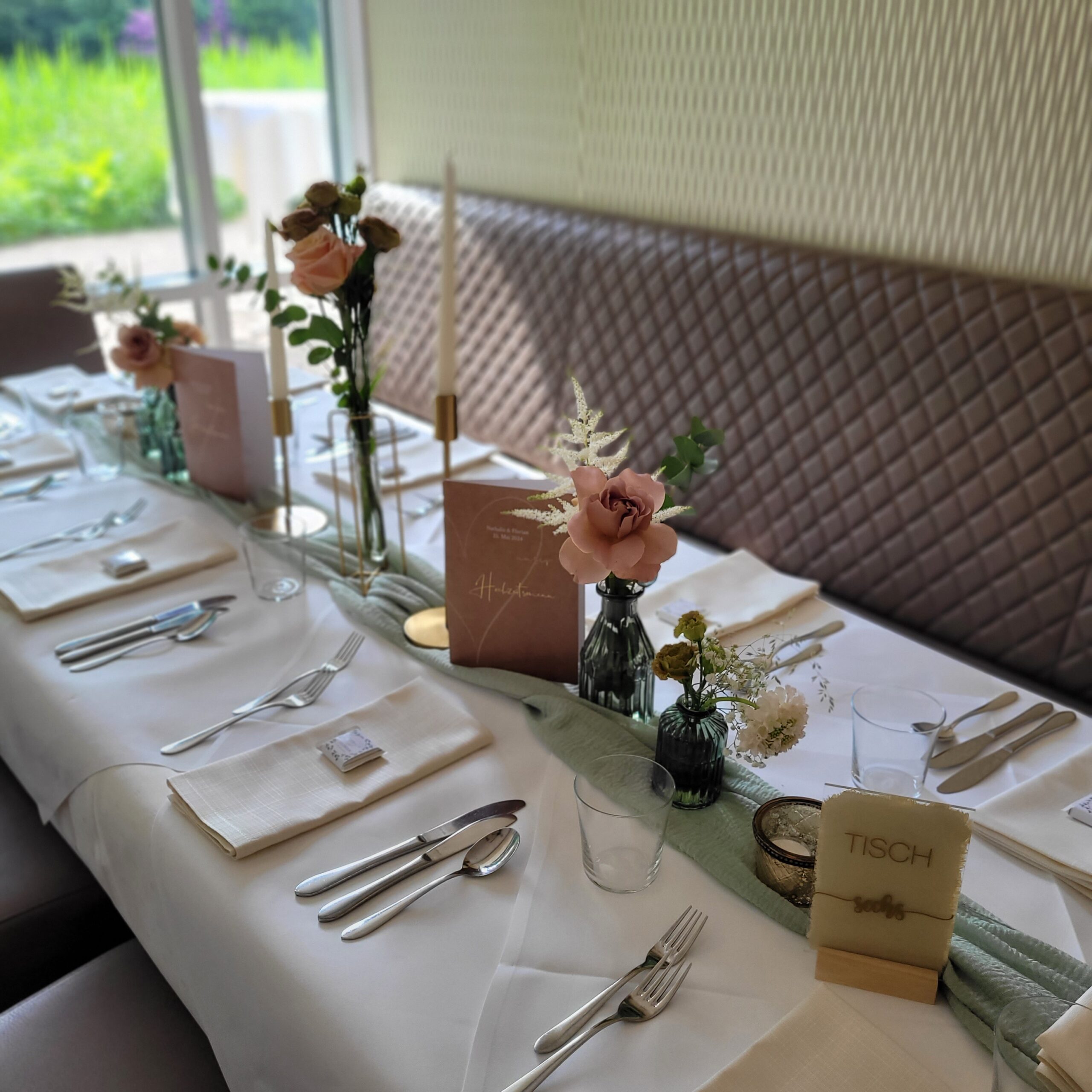 Frische Blumen für 4 Vasen mit schmaler Öffnung in unterschiedlichen Höhen.