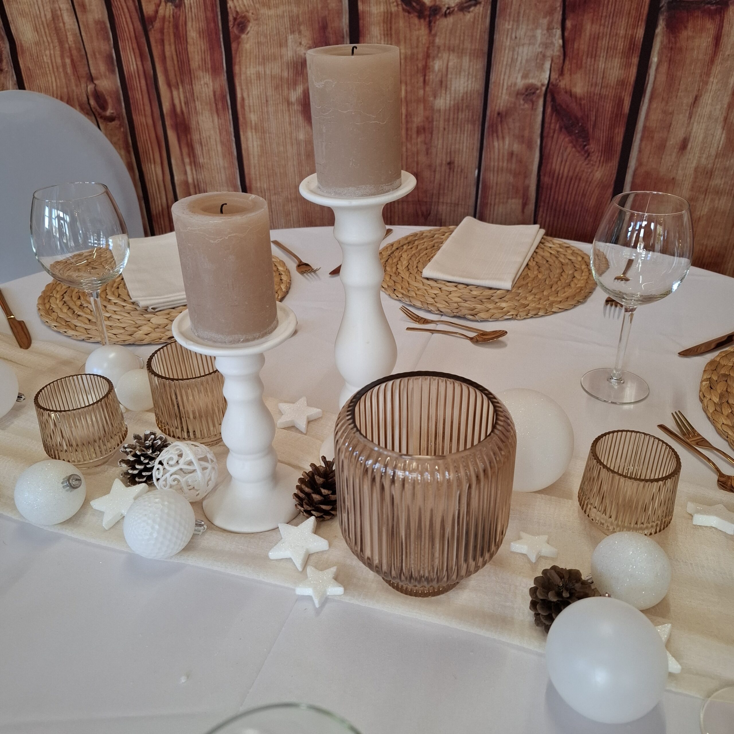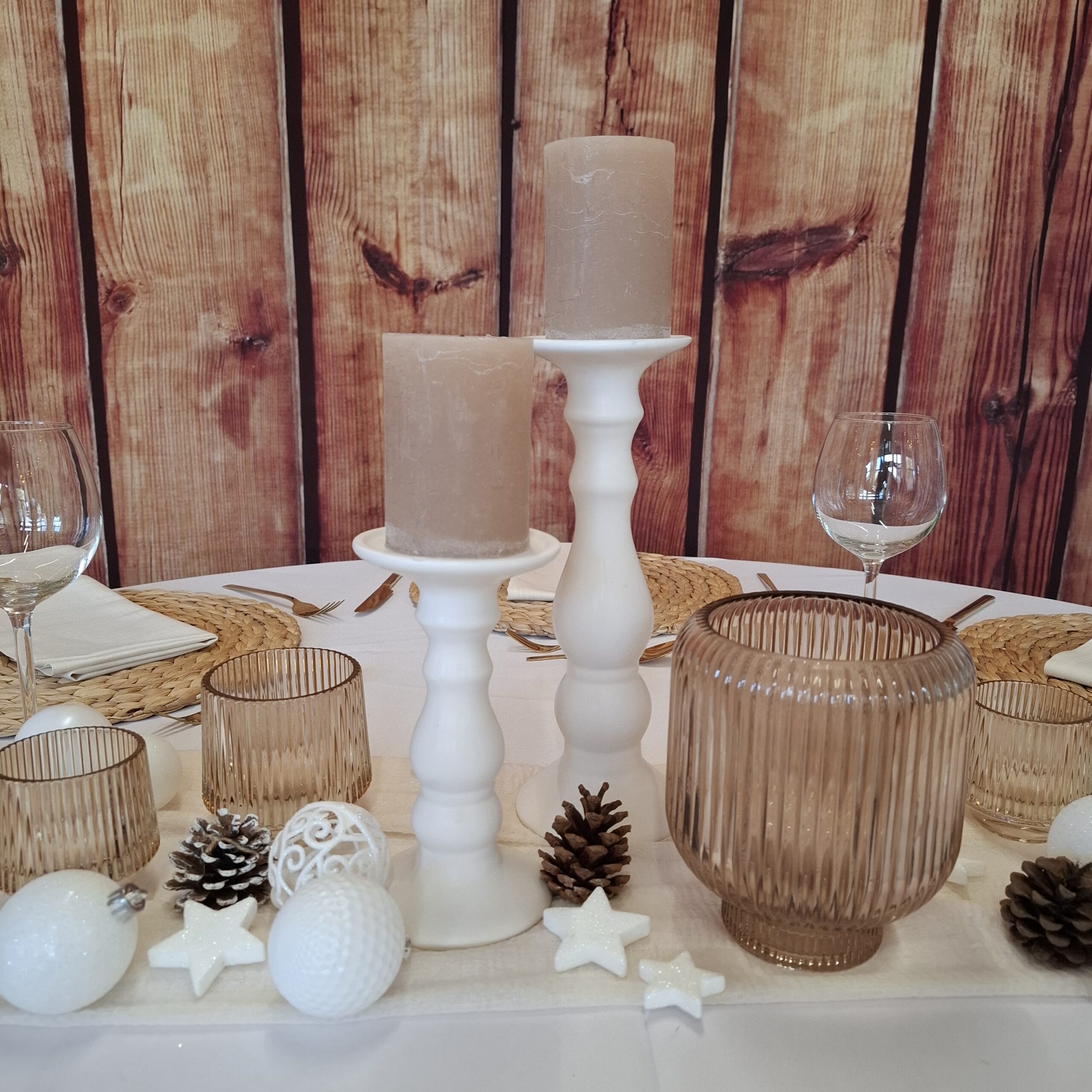 – Kugeln und Sterne in weiß, Zapfen in braun